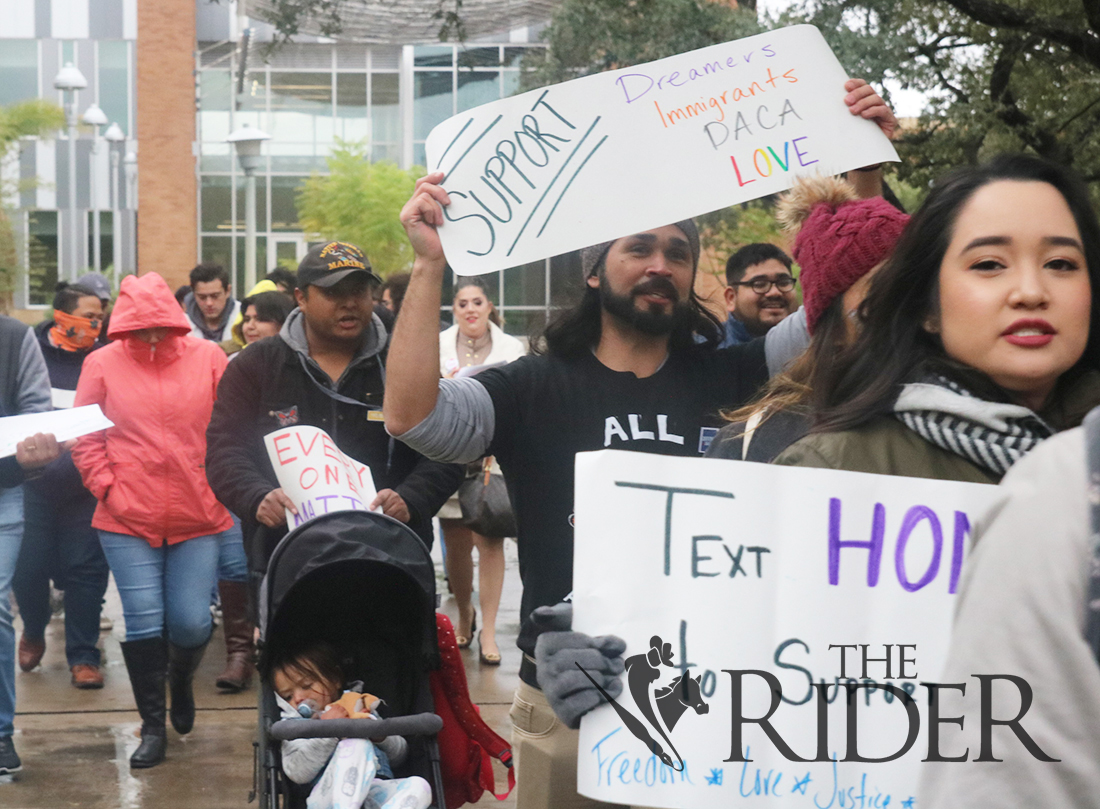 “Vivan los estudiantes! Viva!” A pesar de la lluvia y el frío, los manifestantes marcharon en todo el campus de UTRGV en Edinburg el pasado martes para crear conciencia sobre las audiencias de la Corte Suprema para decidir el destino del programa de Acción Diferida para los Llegados en la Infancia ó DACA (por sus siglas en inglés).