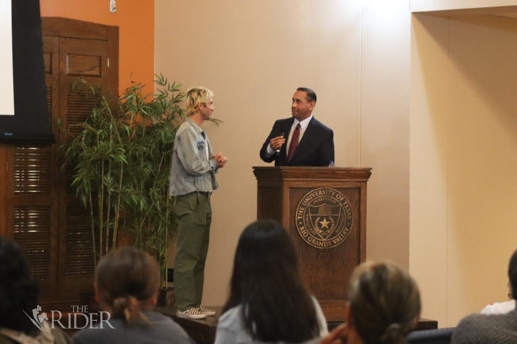 Eduardo ChĂĄvez, director, orador, activista, presentador de podcasts y nieto de CĂ©sar ChĂĄvez, responde a las preguntas del pĂșblico sobre lo que significa honrar a su abuelo durante la Serie de Oradores Distinguidos (Distinguished Speaker Series) el martes pasado. El evento se llevĂł a cabo en PlainsCapital Bank El Gran SalĂłn en el campus de Brownsville. Citlalli Torres/Fotos The Rider