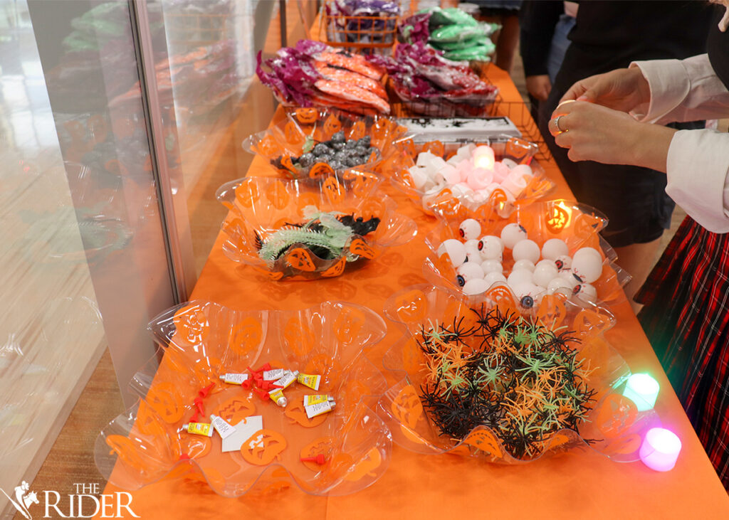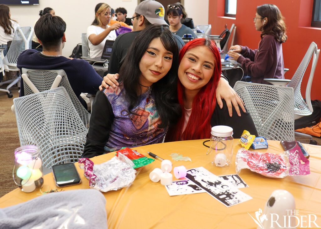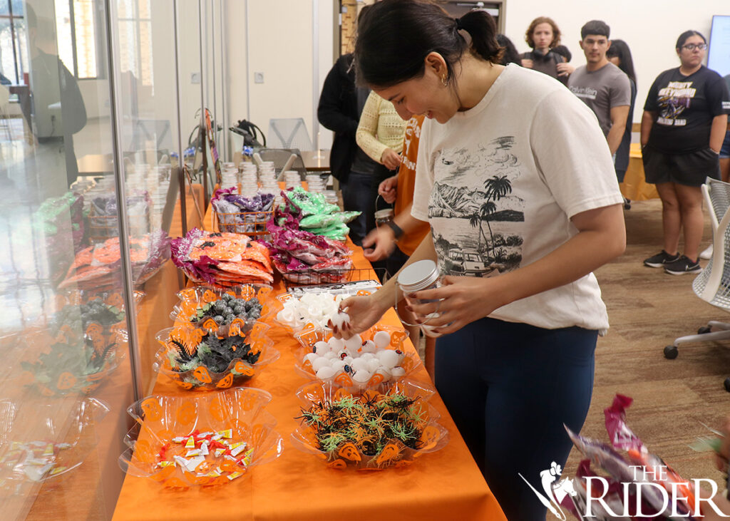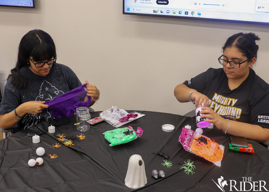Students pick up supplies to create Halloween lanterns last Thursday in the Music, Science & Learning Center on the Brownsville campus. The Involvement Ambassadors and the Center for Student Involvement sponsored the event. Azenett Valdez/THE RIDER PHOTOSJoselyn Garcia, a business sophomore, grabs supplies needed to make her Halloween lantern last Thursday in the Music, Science & Learning Center on the Brownsville campus. Azenett Valdez/THE RIDER PHOTOSDenise Romero (left), a psychology freshman, gets cobwebs ready to decorate her Halloween lantern alongside her friend, Ariana Sandoval, a philosophy freshman, last Thursday in the Music, Science & Learning Center on the Brownsville campus. Azenett Valdez/THE RIDER PHOTOSJeanette Alba (left), a film production freshman, poses alongside Aide Martinez, an integrated health science freshman, while making Halloween lanterns last Thursday in the Music, Science & Learning Center on the Brownsville campus. Azenett Valdez/THE RIDER PHOTOSDuring the Halloween Lantern event, the Involvement Ambassadors and the Community Service Team informed students on how to use and navigate V Link. The ambassadors want more students to take advantage of the free and fun events UTRGV has to offer. Azenett Valdez/THE RIDER PHOTOSIsabel Moreno, an integrated health science freshman, creates a Halloween lantern last Thursday in the Music, Science & Learning Center on the Brownsville campus. Azenett Valdez/THE RIDER PHOTOSAriana Sandoval, a philosophy freshman, grabs spooky eyeballs, spiders, cobwebs and more during the Halloween Lantern event last Thursday in the Music, Science & Learning Center on the Brownsville campus. Azenett Valdez/THE RIDER PHOTOSBusiness freshmen Cristian Gonzalez and Joselyn Garcia pose as they decorate their Halloween lanterns last Thursday in the Music, Science & Learning Center on the Brownsville campus. Azenett Valdez/THE RIDER PHOTOS