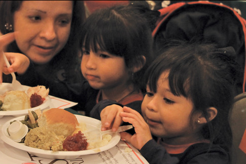 Mirna Cantú (left) watches as her daughters Yulemy and Yailet Vargas enjoy a hot Thanksgiving meal during Wednesday’s 23rd annual Feast of Sharing, hosted by H-E-B at the Jacob Brown Auditorium in Brownsville.