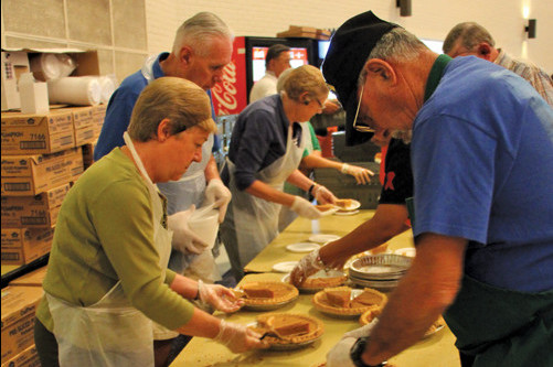 There were 3,000 pounds of turkey, 2,000 pounds of mashed potatoes, 2,000 pounds of vegetables, 120 gallons of brown gravy and 10,000 slices of pumpkin pie served at the event, Loflin said.