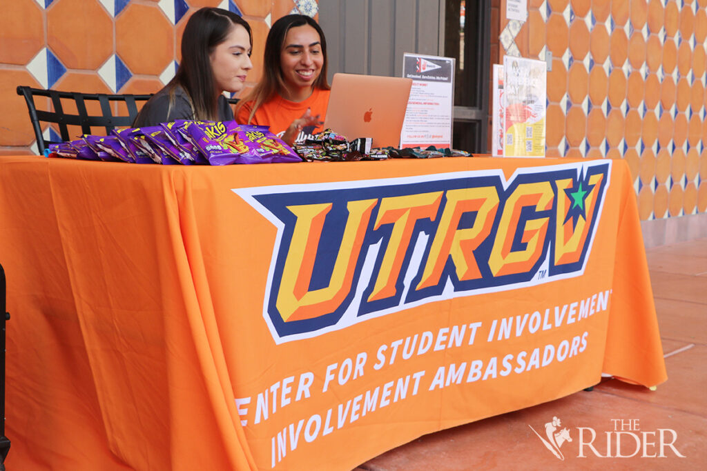 Daisy Vela (left) and Jenna Rivas, involvement ambassadors for the Center for Student Involvement, share information about the different events and organizations on both campuses during a tabling Oct. 17 on the Student Union veranda on the Brownsville campus. DANIELA MARTINEZ SALAZAR/THE RIDER PHOTOSBiology junior Leslie Ibarra (left) asks for information about Make a Difference Day: Repeat Performance Thrift Shop from student ambassadors Daisy Vela and Jenna Rivas of the Center for Student Involvement during a tablingOct. 17 outside the Student Union on the Brownsville campus.Student ambassadors Daisy Vela (left) and Jenna Rivas from the Center of Student Involvement give information about the next event to biology junior Leslie Ibarra during a tabling Oct. 17 outside the Student Union on the Brownsville campus.