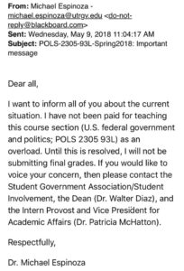 Earlier today, students in an online political science class received an email stating their instructor would not submit final grades because the university had not paid him for the overload course.