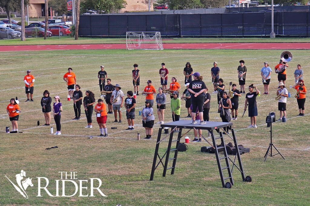 Athletic Bands Director Ronnie Rios instructs about 140 inaugural band members.