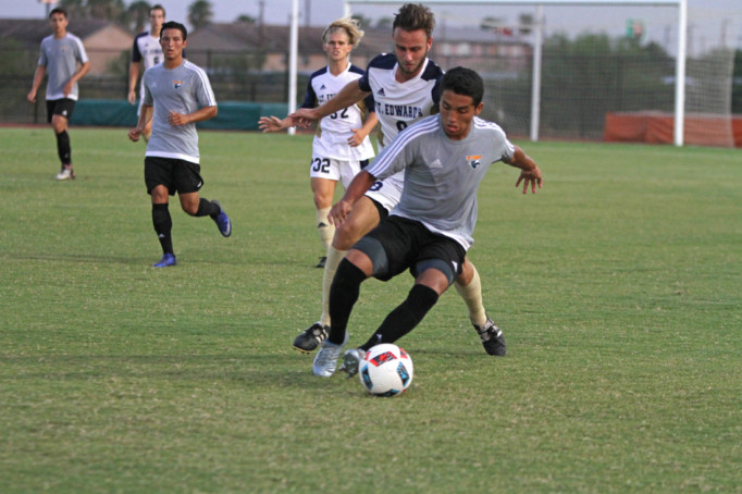 Forward Juanito Ramirez wins possession of the ball in the friendly match against St. Edward’s University on Aug. 17 at the UTRGV Soccer and Track & Field Complex. The game ended in a 0-0 draw./Lesley Robles/The Rider