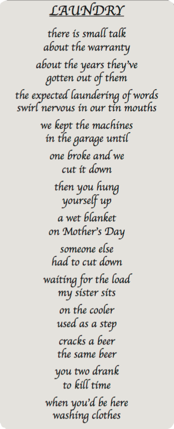Uno de los poemas que el libro contiene es “Laundry”, cuyo tema es un suicidio que sucedió en su familia.