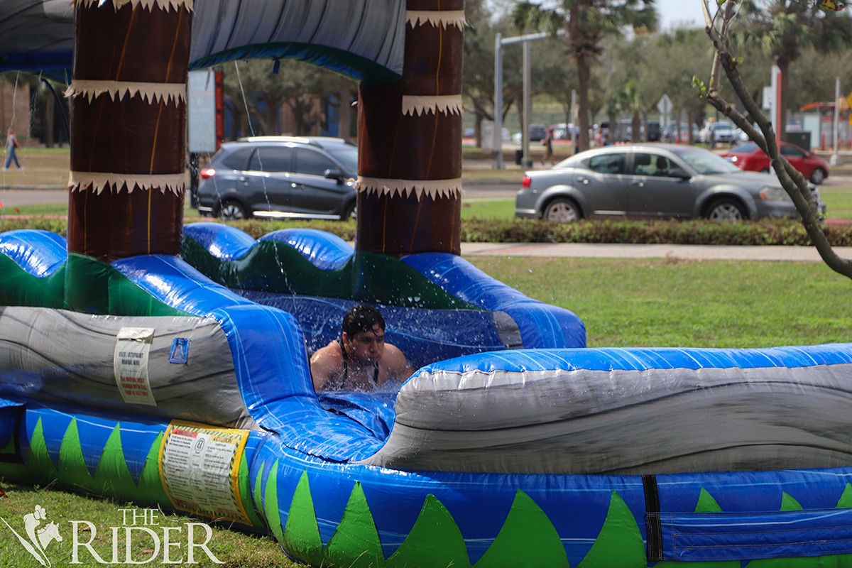 The Spring Break Lu’au took place Tuesday outside the Brownsville Music, Science and Learning Center on the Brownsville campus. The event was organized by the Office of Student Rights and Responsibilities. Mariajose Garza/THE RIDERPriscilla Juarez, a student assistant for the Office of Student Rights and Responsibilities, hands a water bottle to a student during the Spring Break Lu’au Tuesday outside the Music, Science and Learning Center on the Brownsville campus. The Office of Student Rights and Responsibilities gave out free drinks to students during the event. Mariajose Garza/THE RIDERChelsey Guity, a nursing sophomore, plays cup pong during the Spring Break Lu’au Tuesday outside the Music, Science and Learning Center on the Brownsville campus. Mariajose Garza/THE RIDERVincent Taylor, a biology freshman, rides the tipsy driving cars while Marco Huerta, a university police officer, assists him during the Spring Break Lu’au Tuesday outside the Music, Science and Learning Center on the Brownsville campus. The University Police Department provided the activity to simulate what driving under the influence is like. Mariajose Garza/THE RIDERRaul Ruiz, a criminal justice sophomore, rides the water slide during the Spring Break Lu’au Tuesday outside the Music, Science and Learning Center on the Brownsville campus. Mariajose Garza/THE RIDERSpring Break Lu’au attendees walk around during the Spring Break Lu’au Tuesday outside the Music, Science and Learning Center on the Brownsville campus. Mariajose Garza/THE RIDER