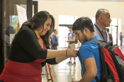 Abigail Rios, a member of the Aspiring Substance Abuse Professionals, pins a red ribbon on Alvaro Robles, a mechanical engineering freshman, at the Red Ribbon event held last Wednesday in the Student Union on the Edinburg Campus.