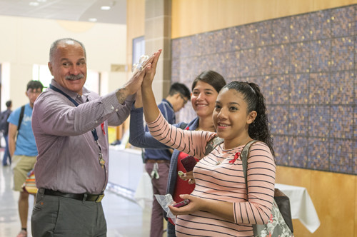 Marilyn Herrera, an education freshman, high fives Raymond Salas, program coordinator for the Zen Recovery Center, on the Edinburg campus after taking the pledge to live drug and alcohol free. The Red Ribbon event took place last Wednesday at the Student Union to remind college students of the commitment they made when they were in middle school and high school to have a drug free lifestyle.