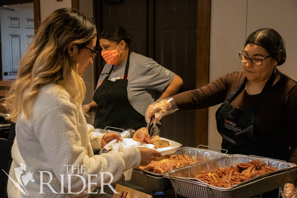 UTRGV students, faculty and staff line up to receive their meal during the International Thanksgiving Luncheon on Nov. 21 in PlainsCapital Bank El Gran Salón on the Brownsville campus. This event was hosted last Tuesday at the University Ballroom on the Edinburg campus. Aura Velasquez/THE RIDER PHOTOSStudent employee Allison Cabanzo (left) serves stuffing to a student during the International Thanksgiving Luncheon on Nov. 21 in PlainsCapital Bank El Gran Salón on the Brownsville campus.Student employee Allison Cabanzo (from left), student employee Grecia Rodriguez and Cynthia Yu, administrative coordinator of International Admissions and Student Services, pose for a photo before eating during the International Thanksgiving Luncheon on Nov. 21 in PlainsCapital Bank El Gran Salón on the Brownsville campus.International Admissions Specialist Jessica Cantu (right) serves ham to marketing freshman Brytanhy Silva during the International Thanksgiving Luncheon on Nov. 21 in PlainsCapital Bank El Gran Salón on the Brownsville campus.