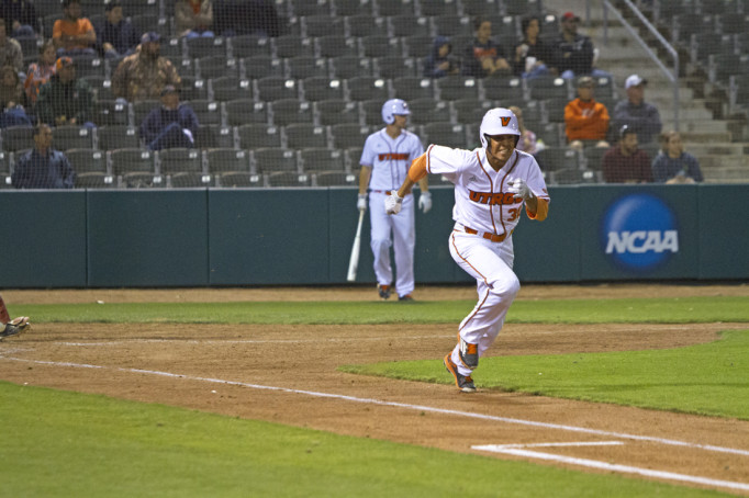 Freshman Anthony Gomez sprints to first base to earn an infield single against Washington State University earlier this season. LESLEY ROBLES/ THE RIDER