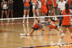UTRGV junior defensive specialist Paulina Ramirez (right) goes for a dig to keep the Islanders from scoring during the second set of tonight’s home opener. Also shown is freshman outside hitter Ioanna Charitonidi.